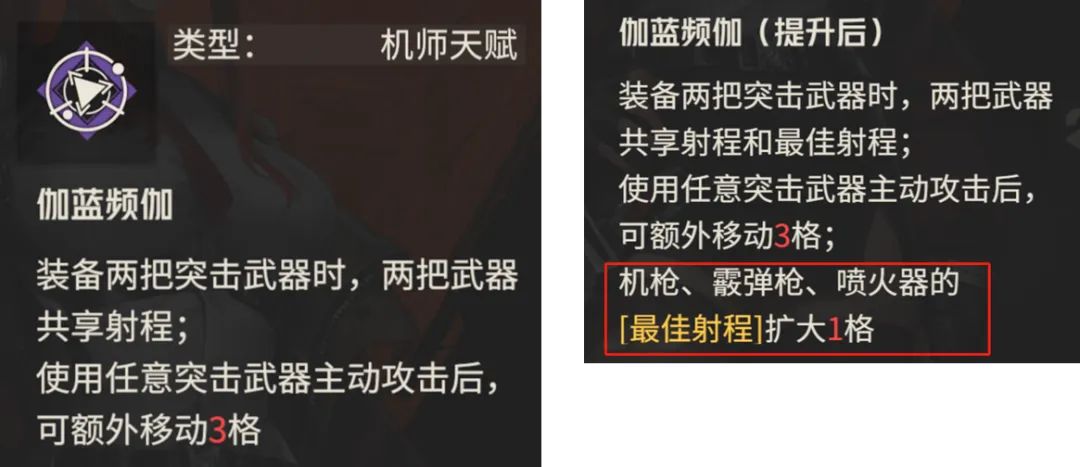 然后弗雷的天赋最大的特色就是共享两把突击武器的射程和战后移动效果,这里可以简单总结为: