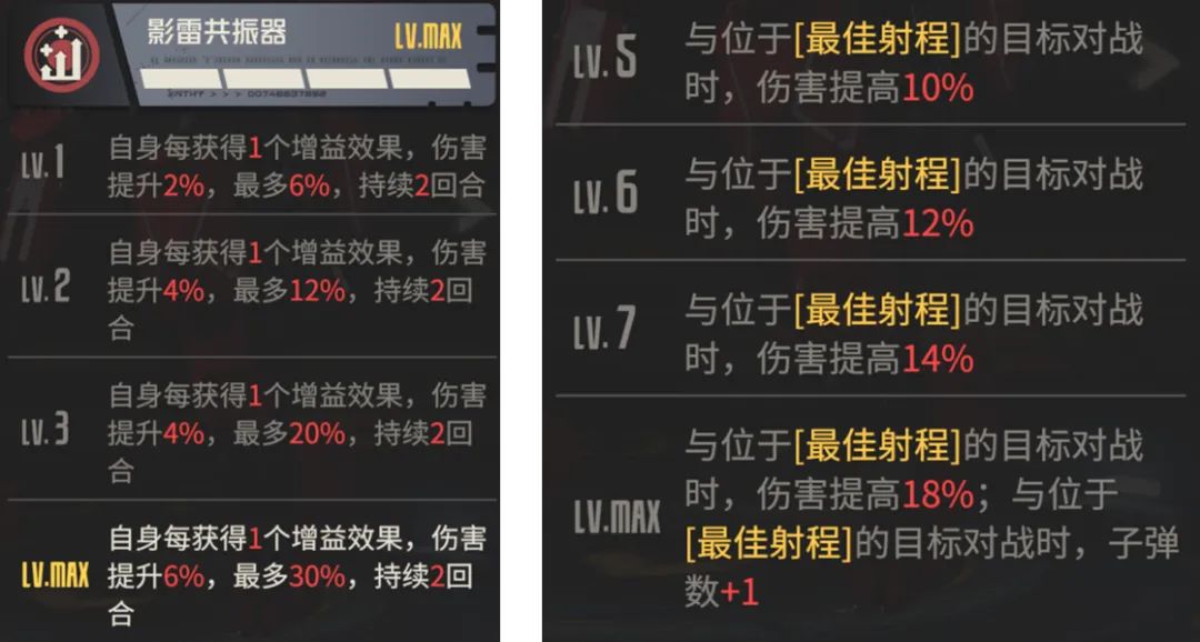 然后是弗雷专属机兵影子兔的两个模组效果,一个是以获取增益buff来增伤的效果,最高难30%增伤的上限还行,第二则是以最佳射程来额外增伤的效果,达到满级后还有子弹+1的辅助,所以总体来讲这个模组还算是比较契合于弗雷自身打法的。