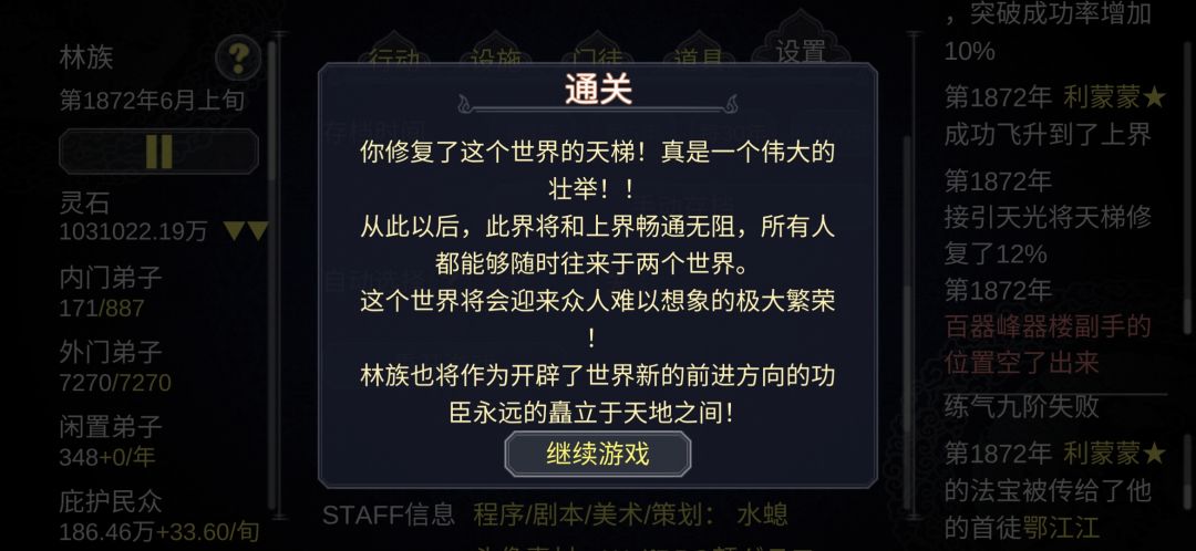 6,信息栏改进,点击可以多出个页面展开查看所有信息。增加信息筛选分类,像那些谁谁谁吃个果子突破率上升的真的不是太想看到,弟子一多信息就刷屏,有些重要信息就被顶走了,虽说是个挂机游戏但眼睛真的要时刻注意信息栏,一个不小心谁又被天劫送走或者修魔了,所以加个信息分类很重要。