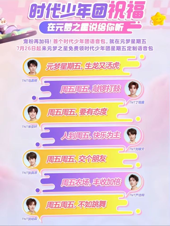 1. 时代少年团:是该游戏的初星代言人。在2023年12月游戏全平台正式上线时就已代言。并且时代少年团还发布了相关视频,2024年7月19日演唱的《元梦之星快乐星期五》也上线。