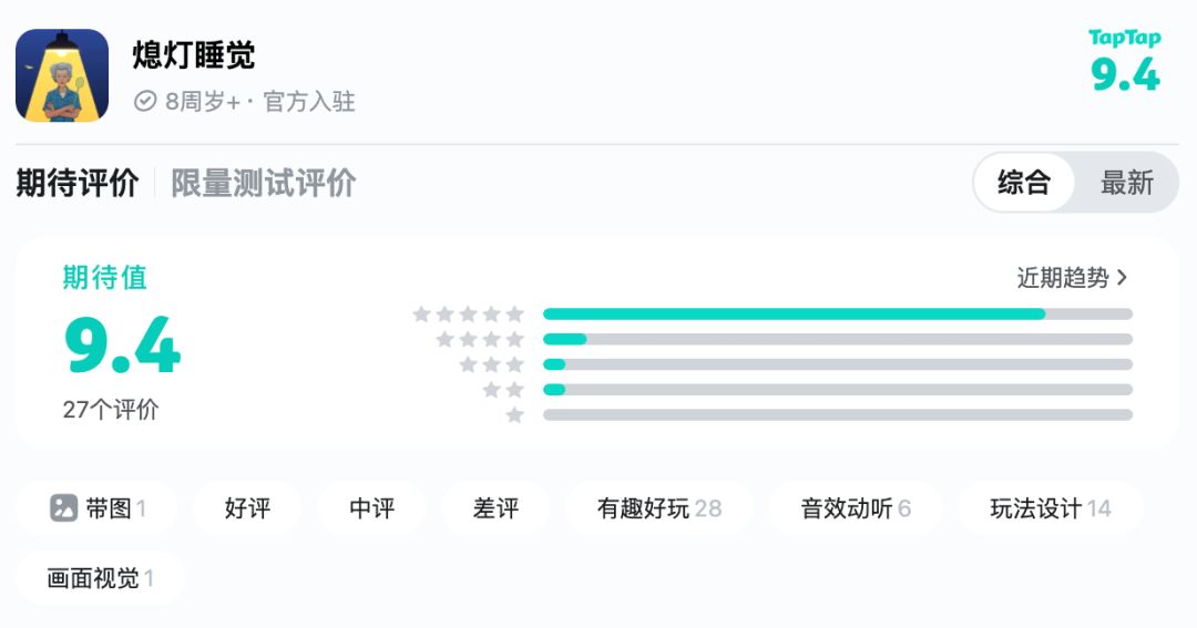截止到11.04早上8点,熄灯睡觉总计有超过1.4万名玩家下载游玩,游戏评价(期待评价27个+限量测试评价73个)总数达到100个!其中不乏各位的支持鼓励和热心建议。衷心感谢大家的喜爱与支持!