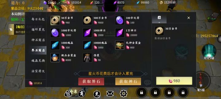 2、开高品质宝箱获得金装,或购买化神金箱子