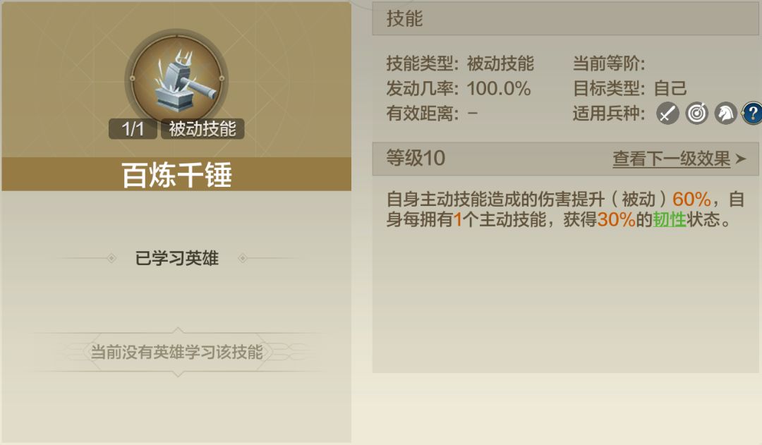 【百炼千锤】来自于英雄拆解-霍去病,被动辅助技能,高额的主动伤害提升以及每拥有一个主动技能,提供30%的韧性状态,对于特别怕控制的主动体系无疑是一个补强,但是自身占用一个技能,就要求英雄的自带技能也需要是主动技能才能完美的发挥百炼千锤的作用。