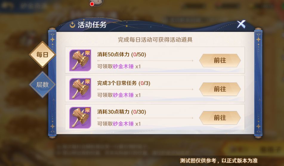 通关指定层数也可以获得砂金木锤哦!通关第1-2层,每层可获得砂金木锤*5。通关第3层可获得砂金木锤*7。通关第4-5层,每层可获得砂金木锤*12。通关第6层,可获得砂金木锤*14。
