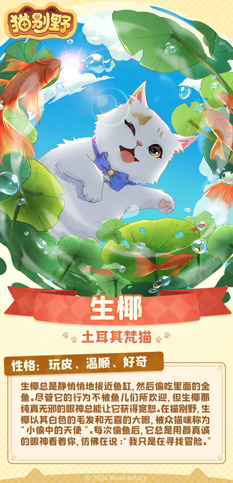猫咪故事:生椰总是静悄悄地接近鱼缸,然后偷吃里面的金鱼。尽管它的行为不被鱼儿们所欢迎,但生椰那纯真无邪的眼神总能让它获得宽恕。在猫别野,生椰以其白色的毛发和无辜的大眼,被众猫咪称为“小偷中的天使”。每次偷鱼后,它总是用最真诚的眼神看着你,仿佛在