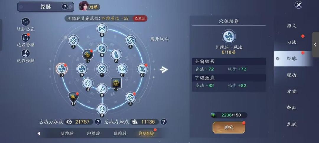 阳跷脉开放3个穴位升级,需要450个精纯石母,带来96点功力提升。