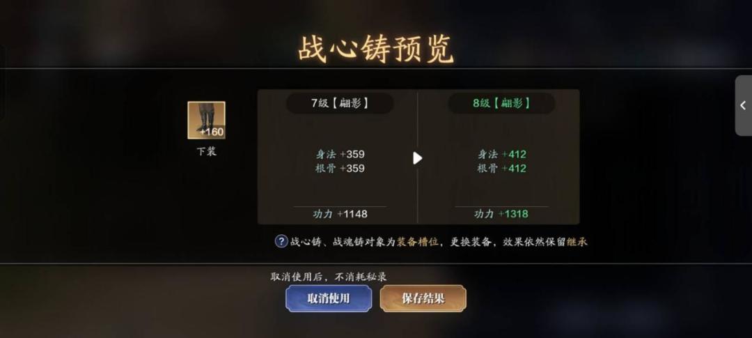 开放八级下装战心铸,打造需要1100胜负令,带来35-170点功力提升。