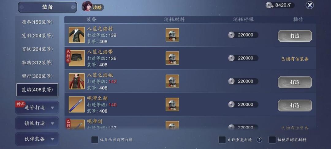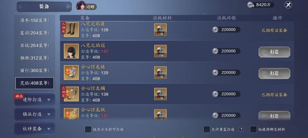 装备打造是139级功力的重要组成部分,总共可以打造2件装备,分别是内衬和项链。内衬打造+精工带来360点功力提升;项链打造+精工带来370点功力提升。