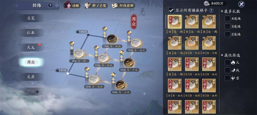 经纬【用众】棋盘第七个白棋槽位开放,可直接插入15级棋子。根据大家的组合不同,功力提升不同,最低提升539点功力(50棋魂金棋子),最高提升800+。