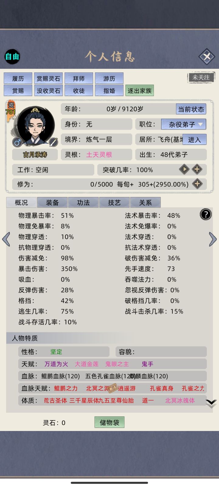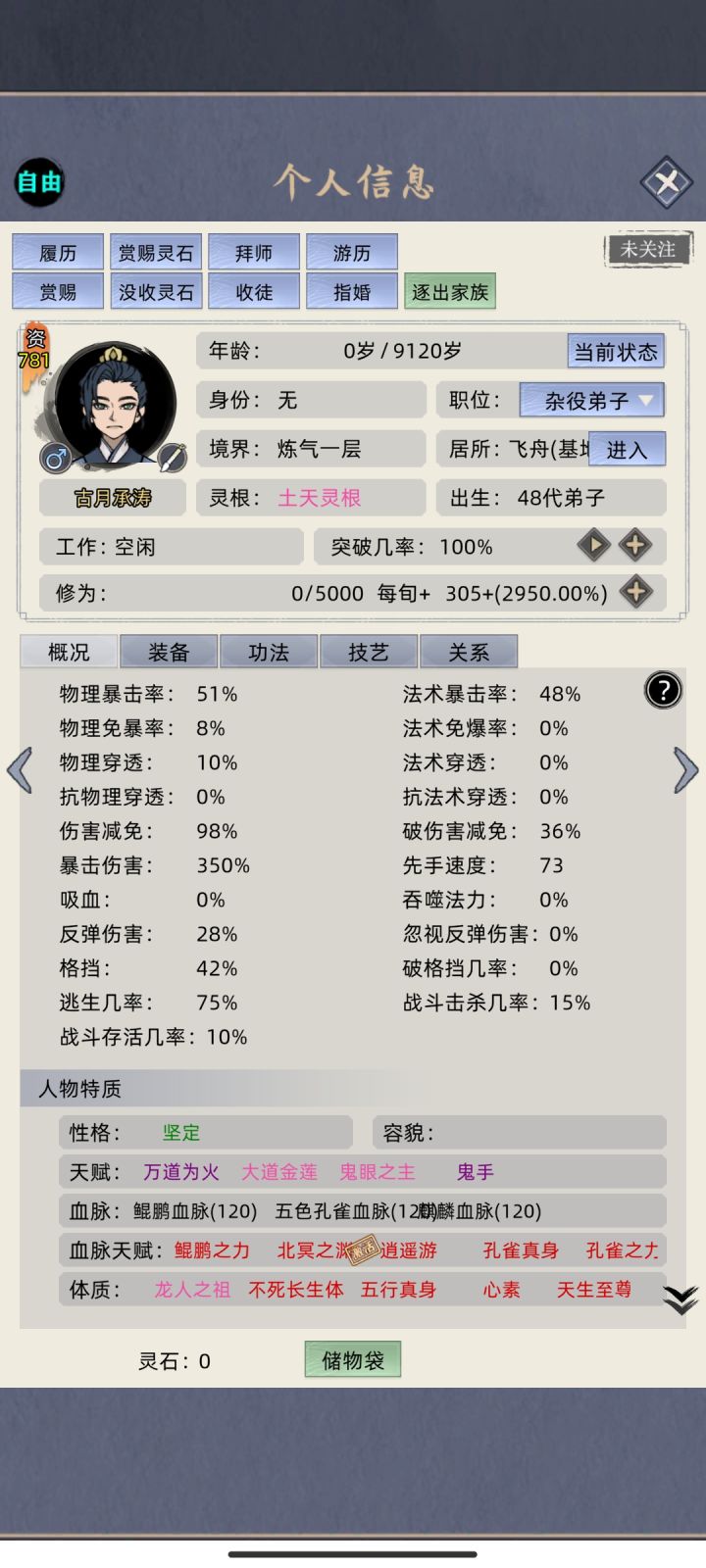 听说新版本控制多,不知道我闪不闪的掉,或许闪避的含金量更高了。这版本真灵血脉加强,名人血脉神通削弱,被全面碾压,推荐麒麟鲲鹏孔雀,紫府推荐白虎,20物穿物爆,建议玩物理。不知道剑道值有没有作用,通过飞升buff叠到5000剑道,500的剑道神通威力应该是外围加成,和爆伤是乘算,届时不得秒天秒地