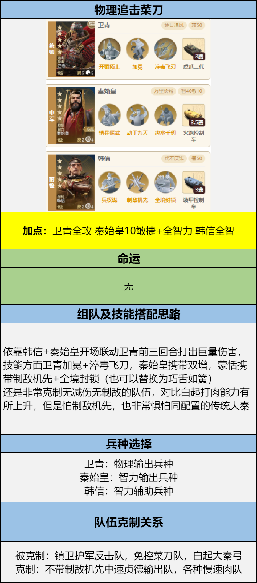 适配体系:秦始皇控制体系,搭配一些控制输出英雄比如白起、卫青就很不错。