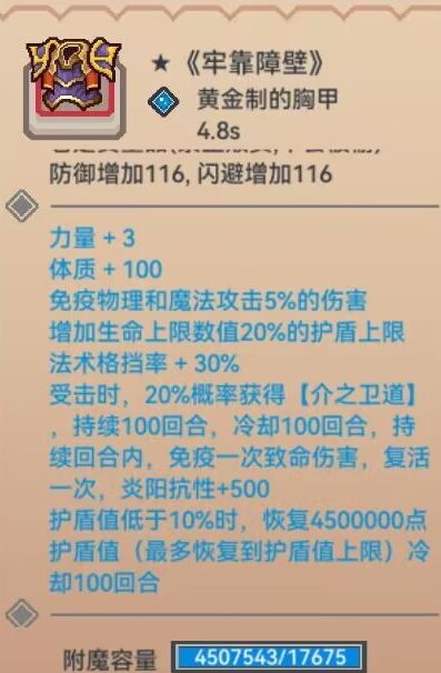 “增加生命上限数值20%的护盾上限”、“受击时,20%概率获得[介之卫道],持续100回合, 冷却100回合,持续回合内,免疫一次致命伤害,复活一次,炎阳抗性+500”。
