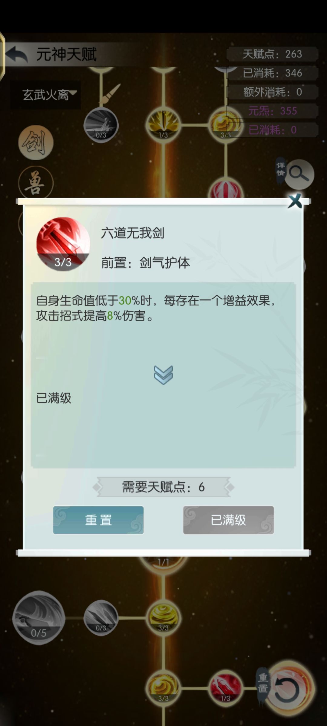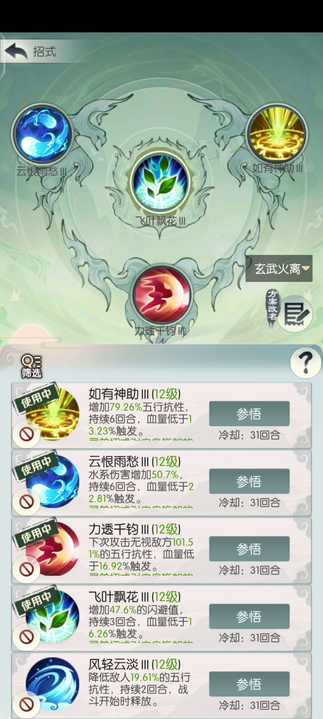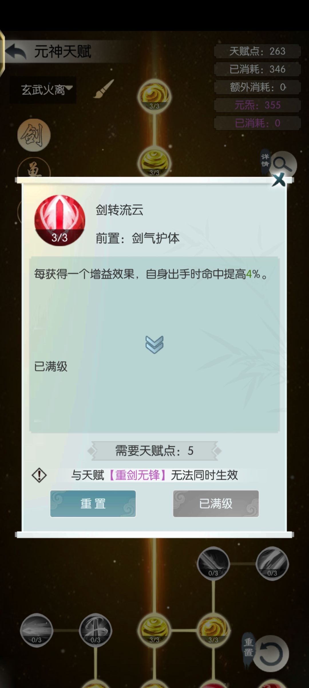 2-此技能提供的4个增益数量可由剑右边天赋“剑转流云”转化为16%命中率以及被“六道无我剑”转化为32%增伤,提供大量命中和伤害。