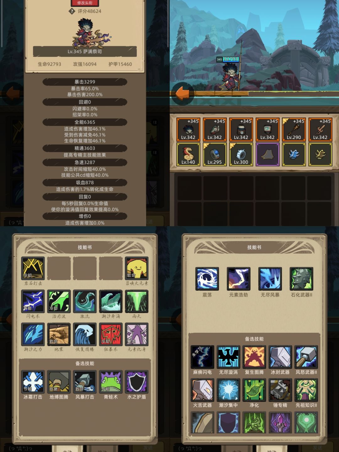装备选择:没开350不知道套装好坏,先暂时用觉醒者4件套,减少元素化身,挂机很快,主手没啥好武器,还是295的法杖,如果前排还扛不住,试试熊猫人法杖吧,奶萨神器。后面等350看看专属武器是啥吧,因为没堆回复,所以副手暴击匕首,暴击戒指和回蓝项链联动,另一个戒指怕死,还是带的机甲。原因就是圣殿最后boss主宰没办法秒我。哈哈哈,这也是奶萨挂机的难点。