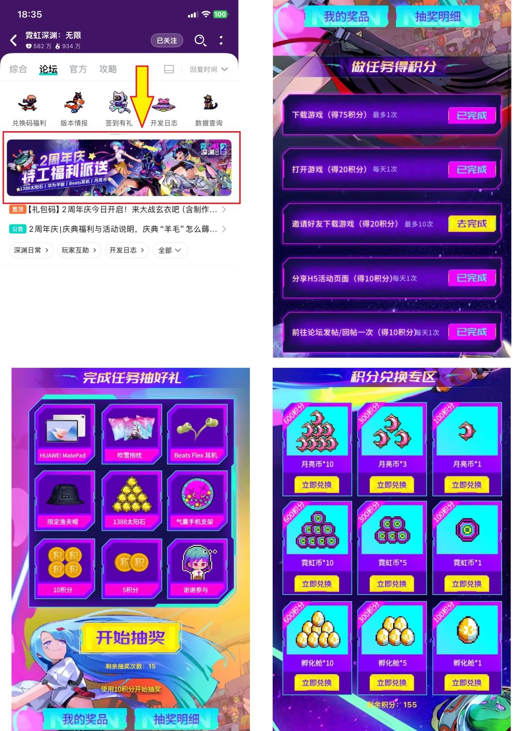 每天签到可以获取积分,积分可以选择抽奖,或者攒积分换取月亮币、霓虹币、孵化仓: