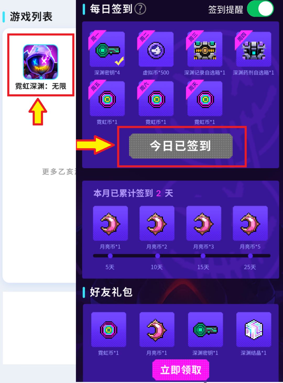 绿色泡泡界面下拉,找“乙。亥。游。戏。中。心”,选霓虹深渊开始签到