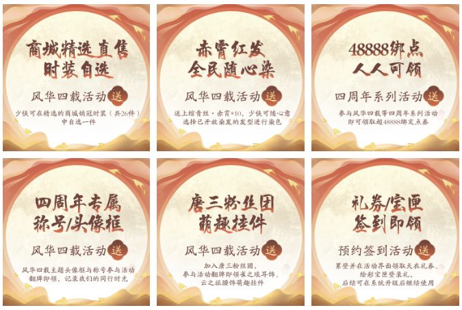 感念少侠一路晴雨相携,值此四周年之际,惟以心意相赠,酬报一二!即日起,少侠可前往游戏内福利-活动处参与“风华四载”、“预约签到”庆生活动,即可在26套“销冠级”商城精选外观中任选其一,更有绾青丝·赤霄*10邀全民重燃热血心怀,48888绑点、四周年专属称号/头像框、唐三粉丝团主题饰品等海量生辰献礼等你揽入囊中!