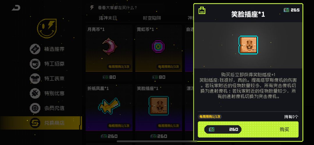 开启后直接开打,今天我们可以从原点1,打到原点3,很简单的,然后再把累计任务全部完成,多打几次就行了,最后,我们一天能获得同调链接货币265个!然后直接换取超级重要的纪念品:笑脸插座!并拉满刻印!作用是为了同调商店再买到“漂浮冰块”,凑齐尖塔两件套,这样我们打拟合就可以引导尖塔套装从而通关了。