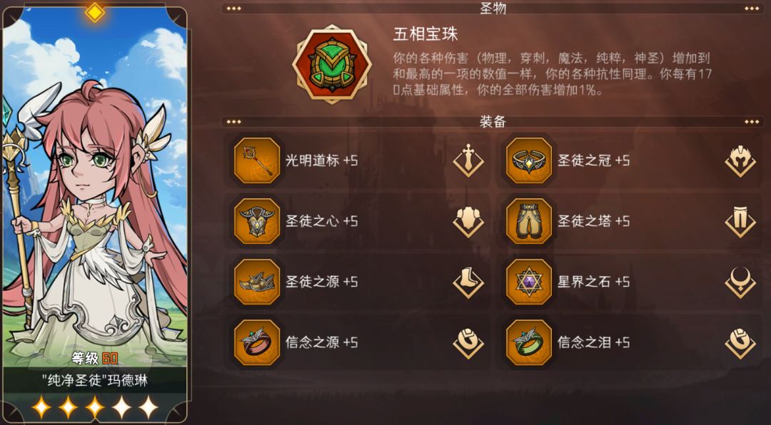 神圣牧首:武器选择群体治疗的专属武器【光明道标】,套装选择 【圣徒套装】,项链用【星界之石】保证回能,戒指选择牧师专属的【冷却剂】和【减耗戒】。所有攻击向的装备词条尽量都选【命中】【暴击】【全部伤害】,所有防御向的装备词条都选【韧性】【闪避】【全部抗性】。圣物选择【群山之祝】来加属性,如果你有某个抗性特别高,可以考虑用【五相宝珠】。项链上的赛季词条选择【鼓舞】,戒指上的赛季词条选择【能量守恒】和【能量上限】。