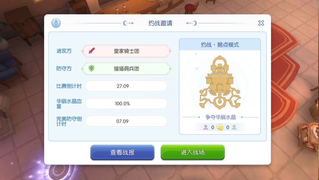 比赛模式:支持选择【经典模式】或【据点模式】,双方胜利条件为击破/守护华丽水晶,比赛时长为30分钟,切换选项时地图示意图随之变化;