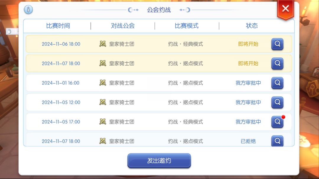 约战发起方公会会长通过【约战界面】-【邀请对手】-【设定规则】-【发送邀请】发出约战邀请,并等待对方同意。