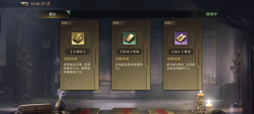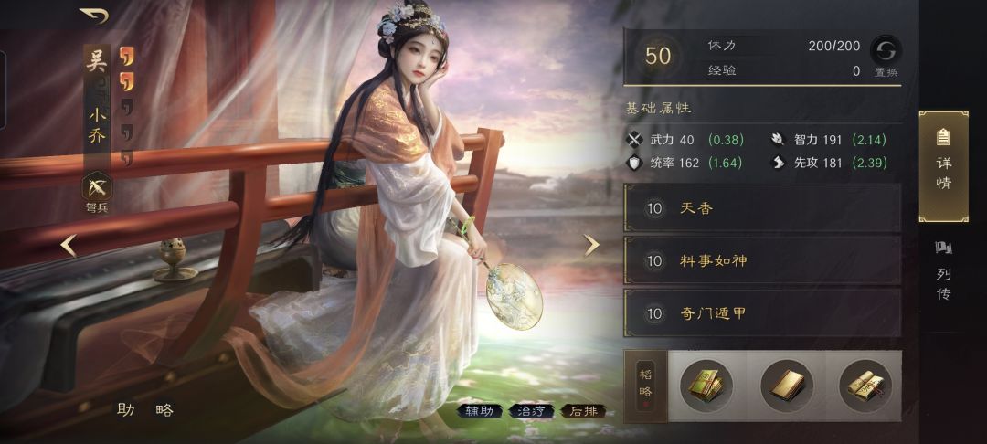 小乔战法:天香+料事如神+奇门遁甲。韬略库:公瑾信(专属)+机动残章+励心善本。弩兵特性劲弩,专精点亮谋定后动。这三人的站位情况,是大乔和周瑜在前排,小乔在后排的结构。核心是提升周瑜的防御,也适当加强了大乔的输出,毕竟人家还学了一手断粮。