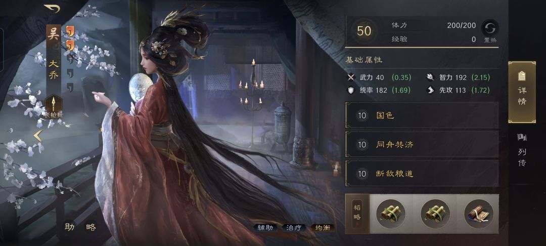 大乔战法:国色+同舟共济+断敌粮道。韬略库:合战手抄+兵情手抄+先战手抄。长枪兵特性破敌,专精点亮坚定不移。