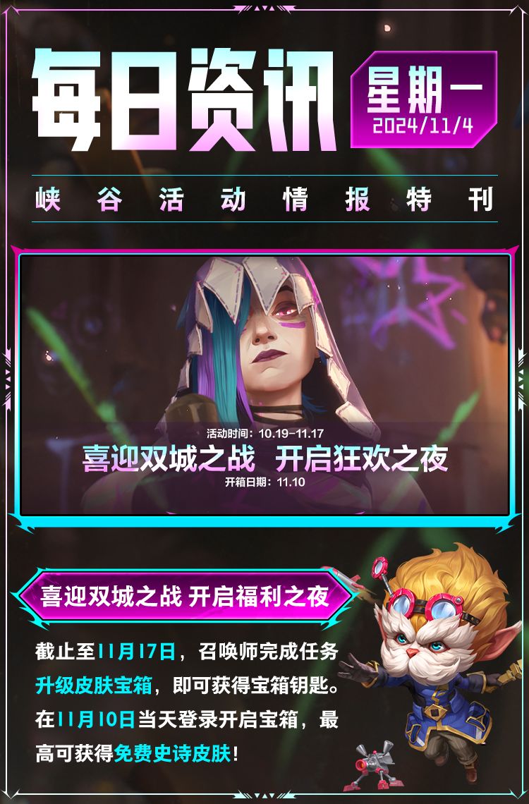 今日登录游戏前往签到的召唤师,可以领取周一登录幸运宝箱,开启后就有机会获得龙魂水晶、史诗皮肤随机宝箱奖励~