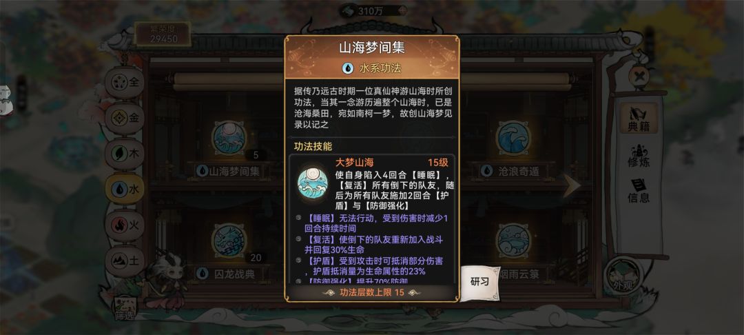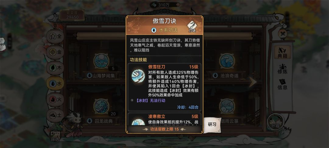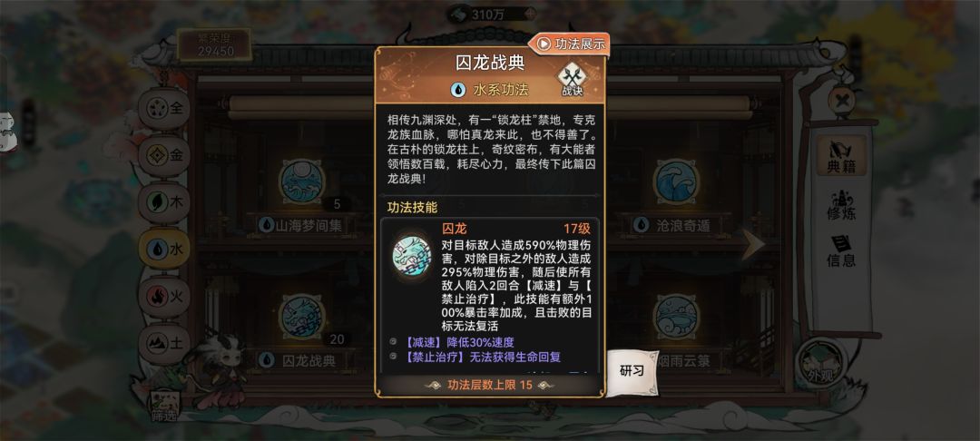2、水系功法组合:囚龙战典(禁止治疗、复活)、傲雪刀诀(强力收割、冰封)、听潮剑诀(解控)等功法适合水系卫寒,在控制和输出方面有不错的表现。