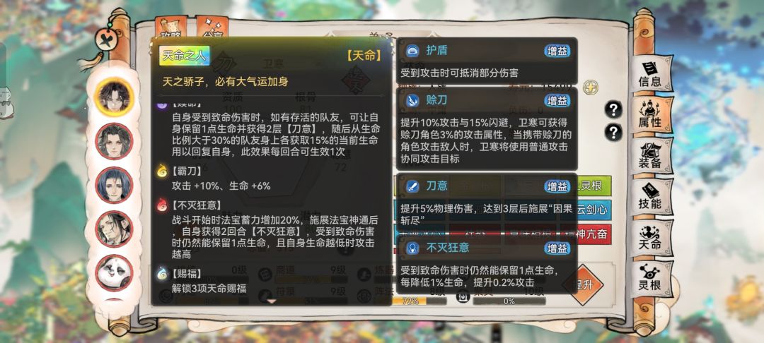 战斗开始时法宝蓄力增加20%,施展法宝神通后,自身获得2回合“不灭狂意”,收到致命伤害时仍然能保留1点生命,并且每降低1%生命,提升0.2%攻击。尽快开启法宝,可以大大提升卫寒在战斗中的生存和爆发能力。