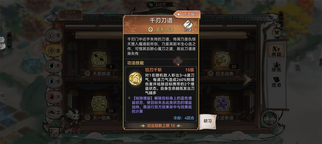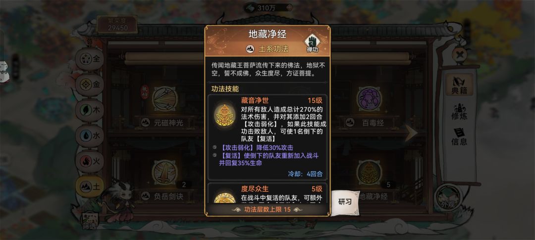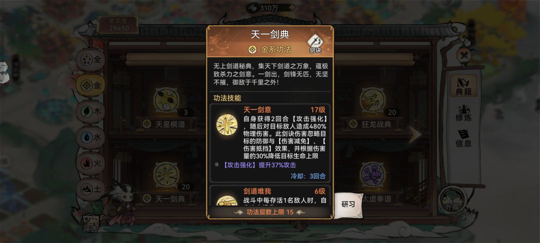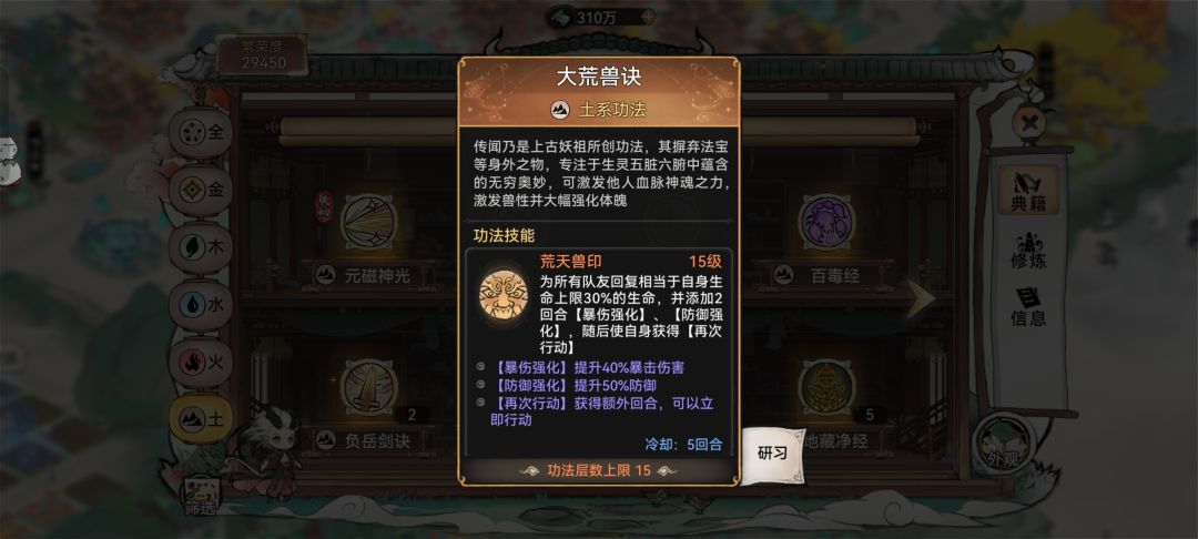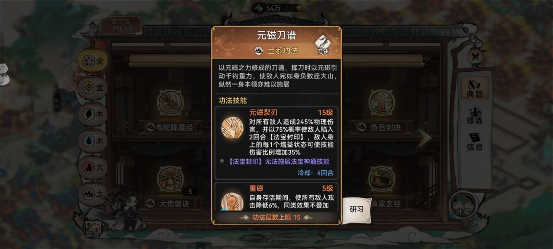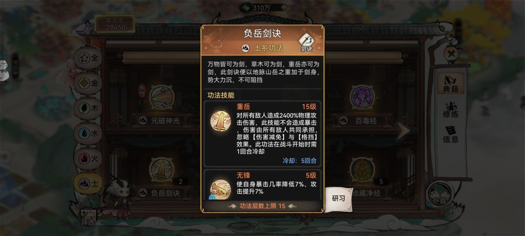 3、土系功法组合:仅有负岳剑诀(高倍率)、元磁刀谱(高伤、减攻、法宝封印)能用,但总体不如金系和水系功法契合度高。