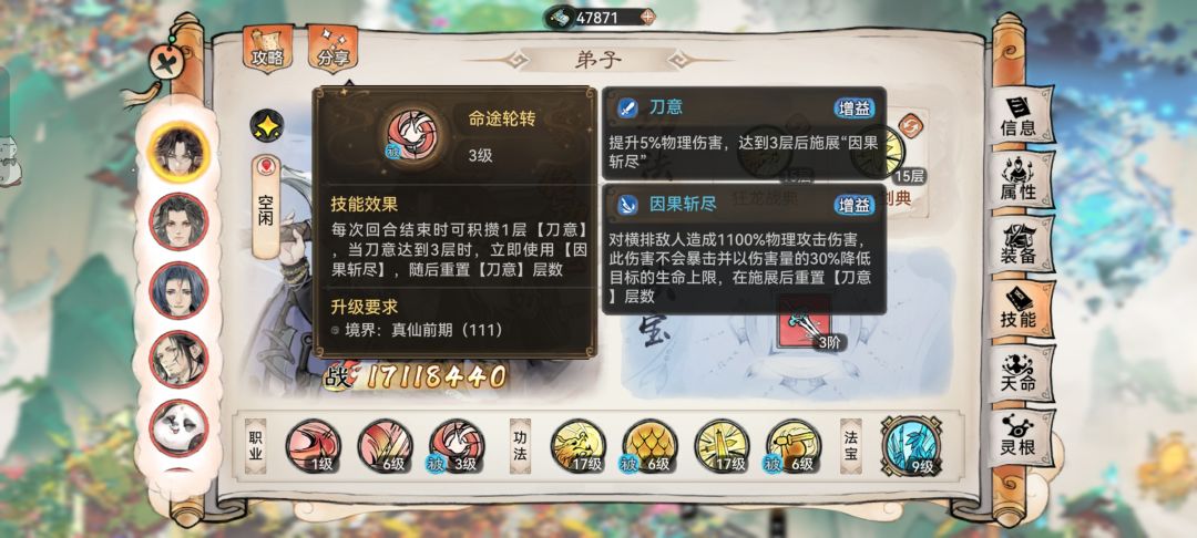 (1)因果斩尽:对横排敌人造成高额物理伤害,并按照伤害量30%比例降低目标生命上限,缺点是不能暴击。