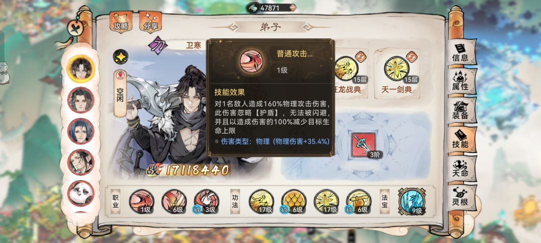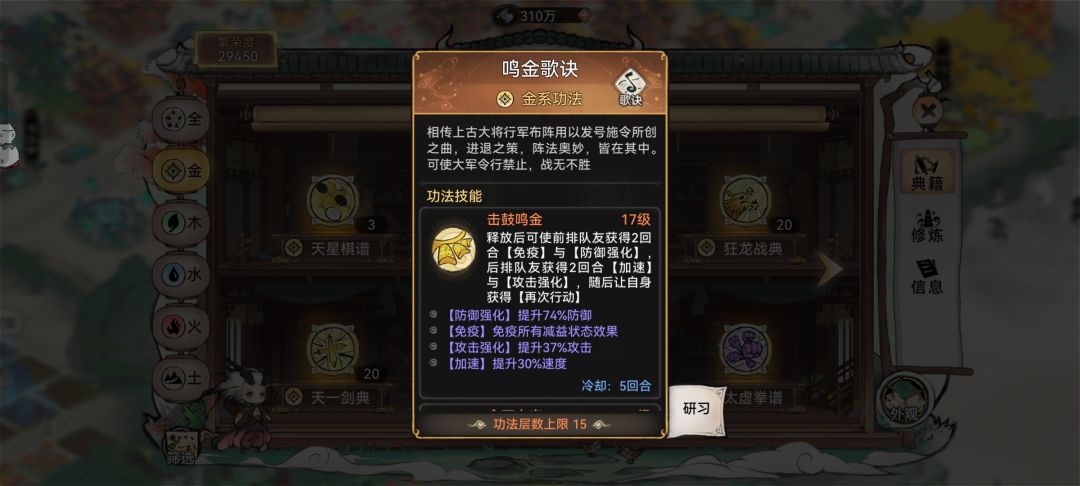 (2)千刃刀谱+鸣金:千刃刀谱可以提升卫寒的速度和闪避率,弥补卫寒速度成长较慢的缺陷,使他在战斗中能够更灵活地躲避敌人的攻击。鸣金则可以增加伤害,并且其技能效果也能为卫寒的输出提供一定的辅助,加快法宝释放速度。这两个功法搭配可以在一定程度上提高卫寒的综合输出能力。