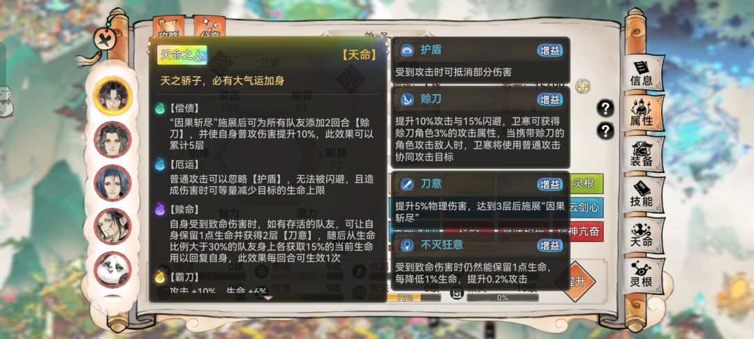 “因果斩尽”施展后可为所有队友添加2回合“赊刀”,并且使卫寒自身的普攻伤害提升10%,此效果可以累计5层。既增加了队友的攻击和闪避能力,也提升了卫寒自身的普攻输出能力。
