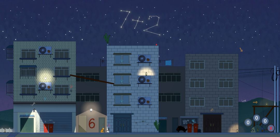 玩家在一开始进入第二区域的两个红色垃圾桶前,可以看到3个在地上的解密提示,玩家需要通过场景中找到对应密码,并且在一个有点抽象的密码机上按顺序输入后,进入室内的窗户才会被打开。
