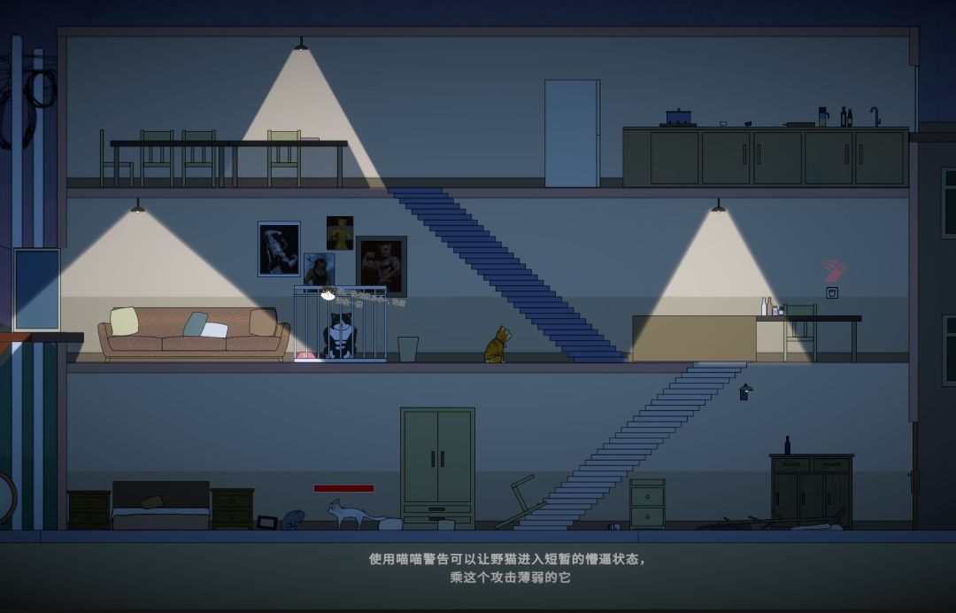 在第二区域的室内中,玩家会收到喵大壮派发的任务,因为他被关在笼子里,就需要玩家去帮忙解救一楼正在被野猫欺负的小小,这时玩家会发现通往一楼的路被倒下书柜挡住,玩家只需要通过开关关闭灯,就可以让书柜消失。玩家进入一楼就会触发战斗(这里有提示的操作有Bug,正常攻击打败野猫即可)。玩家打败野猫后就可以通过大门离开房屋。