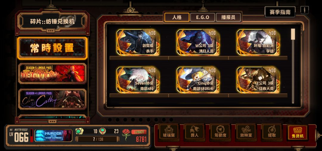 赛季角色除了当前赛季-1的赛季角色和ego无法直接换取,所有的都能换,而且在这里,你无需担心“强度落后”的问题。更无需担心常驻换取人格不如赛季换取人格的问题(真要问别人强度榜,好几个t0都是常驻)