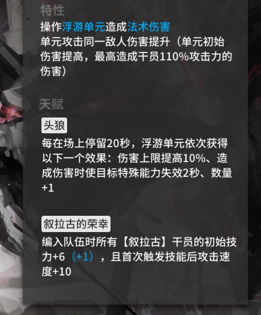 这个技能强烈建议专精,不仅攻击范围会扩大至这个战场,并且狼会缠着敌人一直刮痧,还会造成恐惧,唯一缺点就是,没有法穿,虽然刮的快,但是面对高护甲敌人会略显吃力,所以,明日方舟设计师。。。,希望把二模设计的好一点,别再继续整抽象烂活啦。