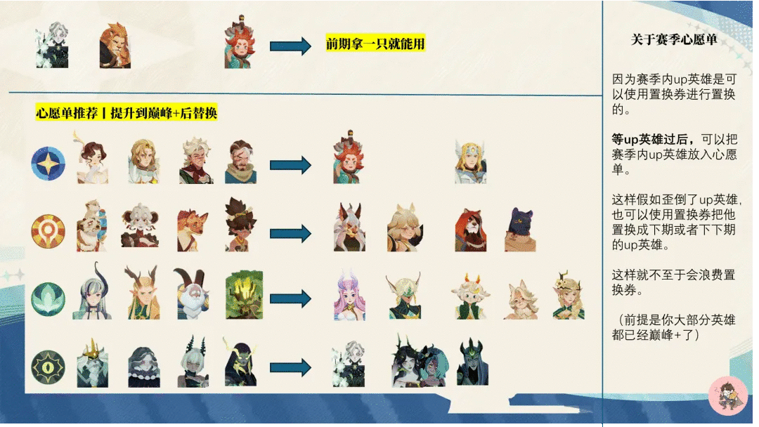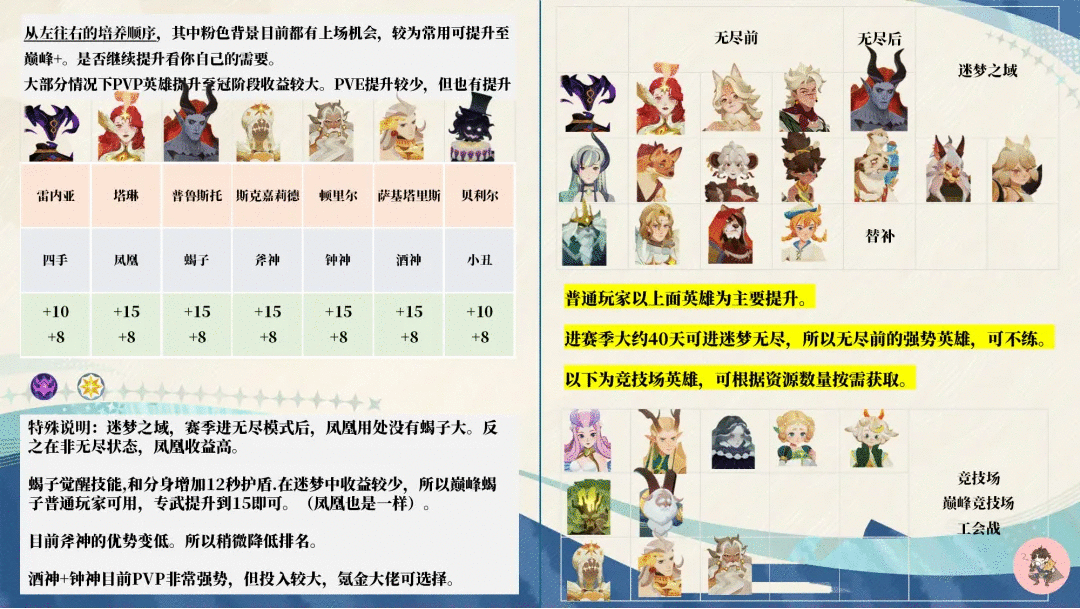 当你副本英雄满时(巅峰+),可选强力的up去获取。赛季的中后期,需要刷女神试炼,假如你想要一个好的迷梦排名,还是有很多英雄要练的。