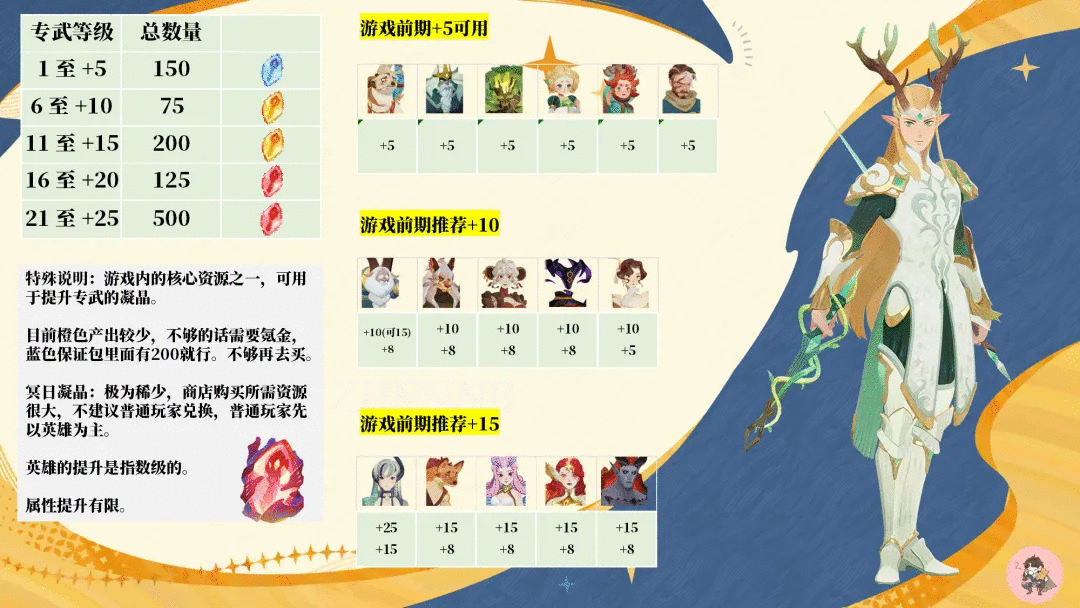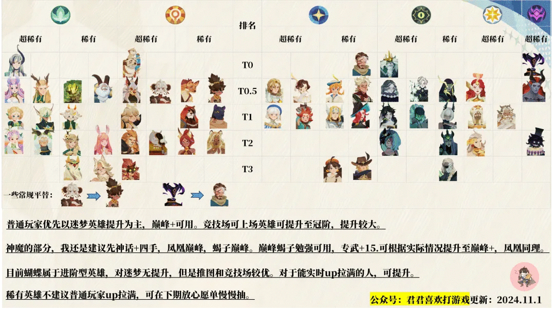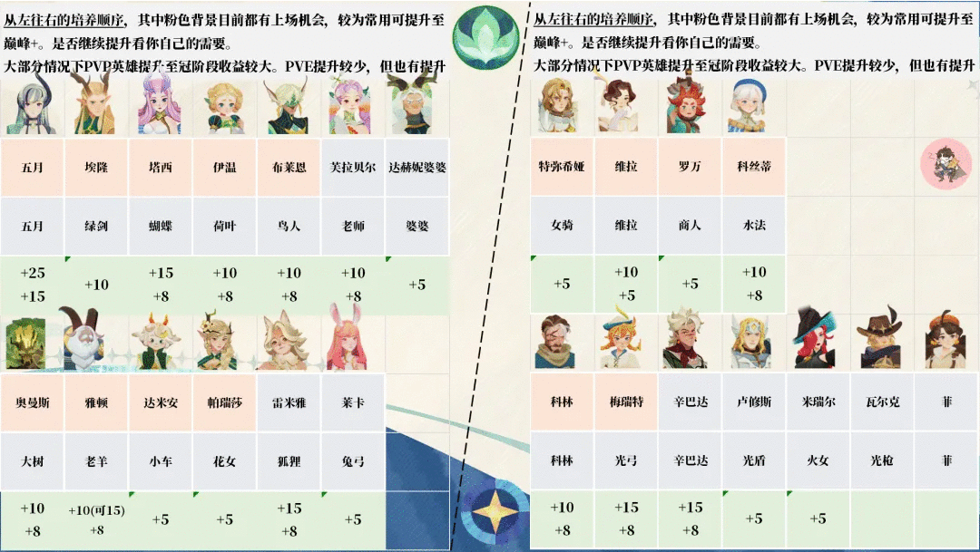 四色英雄首先以巅峰+为主要提升,在资源多余的情况下可提升至冠阶。冠阶对迷梦的提升较少,对竞技场提升较大。