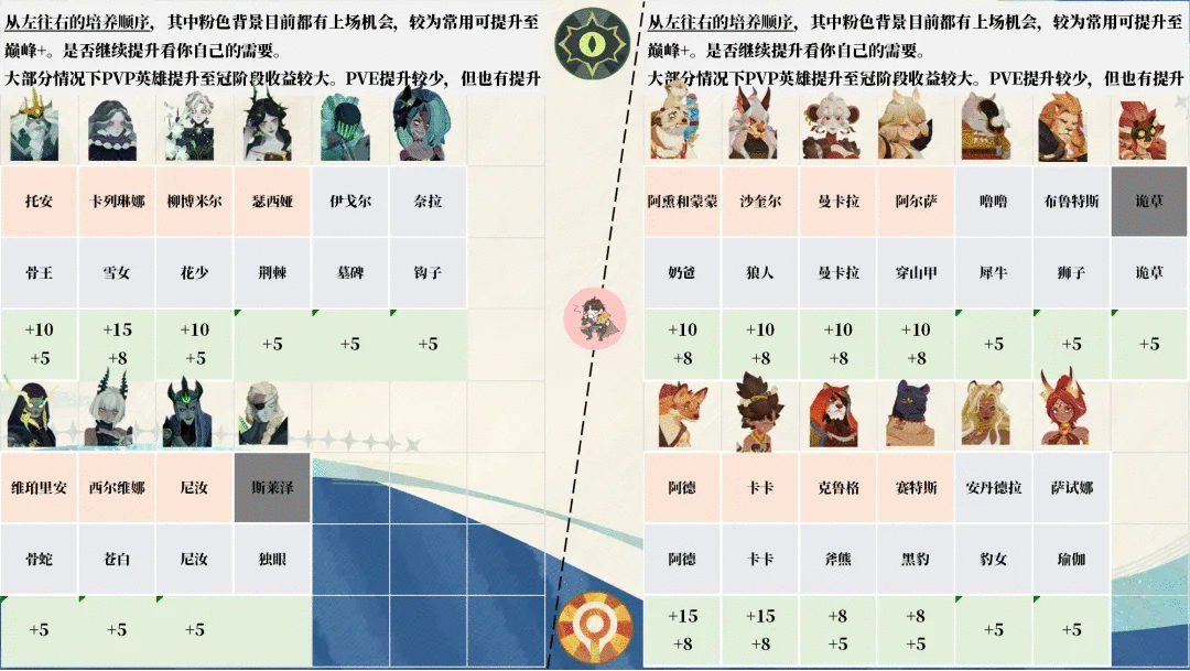 都是以巅峰+为优先基准,目前女神试炼对英雄池的需求很大,所以一些T1英雄也要提升到巅峰+。冠阶1需要六只本体,投入较大。