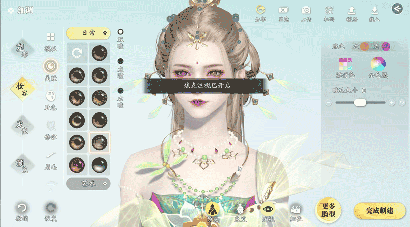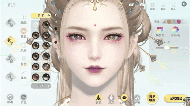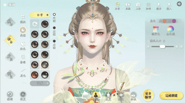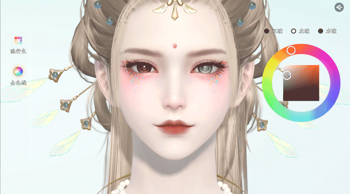 调整完毕后,就可以进行上妆啦~新增异瞳功能和多款全新妆容,少侠可自由对美瞳、肤色、修容、眉毛、眼影等方面进行细致化调整。