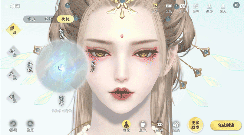 选完预设脸型后,可进入面部细调界面进行面部塑形,在多达千余项捏脸参数支持的基础上,我们也提供了更为快捷的四维自设风格的动态调整能力,少侠可自由选择更趋向于稚幼、异域、东方、御柔等风格的面容。
