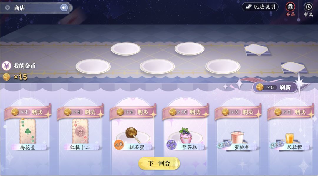 每回合结束时会根据金币数获得利息,拥有50金币时达到上限可获得10金币利息,所以前5回合不建议使用金币刷新甜品,有什么甜品先买来用。积攒到利息上限后再用金币刷新购买心仪的甜品/饮品;