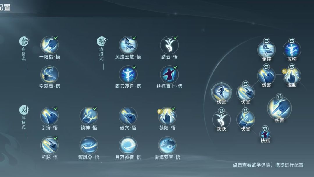 1. 先普攻起手,接着释放大招,给敌人挂上“悬剑”buff,开轻功【风云流散】,自身获得“游风”状态