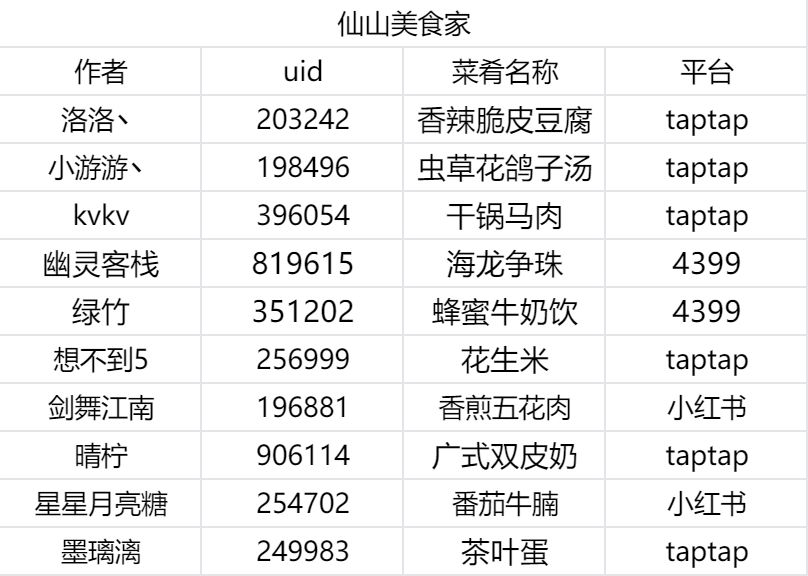 ●【仙山美食家】:评选出10份综合热度较高但无法实装到游戏中的作品,并给予作者【美食家礼包+周边钥匙扣】的奖励
