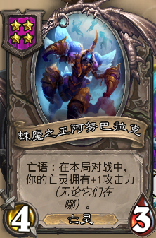 亡灵亡语复生随从很多,最不缺的就是频率,这个流派战力还是得依靠高额攻击力,蛛魔之王阿努巴拉克就是我们攻强的核心来源,有条件记得套复生。亡语效果是本局所有亡灵攻击力全部+1,有野兽的对局可以配合鹦鹉提高效率 ,带鹦鹉的话,就不用给巴拉克套盾了,瑞文来了也可以带上打打工。