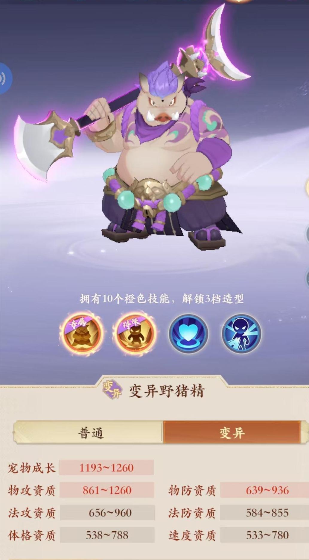 这只野猪杀马特丑萌丑萌的,二档的皮肤我觉得更可爱一点,体资一般物防还不错,条件满足的情况下被动可以减伤20%,适合做耐攻,但是定位一般,没啥特色,我不想花资源培养。主要是丑拒,但是这个宝宝培养好了应该是很难杀的。这个留个大神开发吧