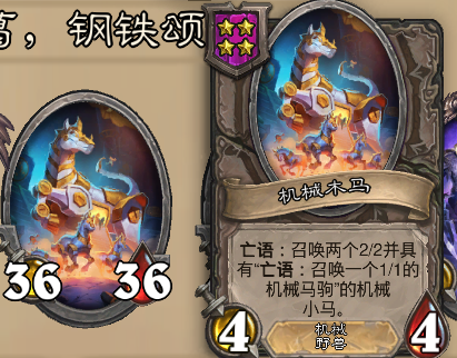 机械木马是更新后新增的混合随从,自带机械和野兽双属性,我们可以利用这个特点在前中期给它贴手风琴机器人这种经济磁力。有瑞文格子够的情况可以在第一波死亡,铺四个2/2并具有亡语的机械马驹,在白狼buff之后这些小马也有不错的战力,应对跳操和频率流亡灵有不错的效果。