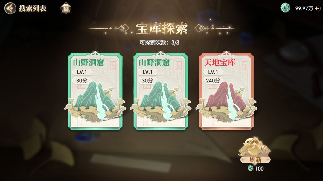玩家搜索山河宝库,并派遣衍灵进行探索,每天最多3次,每个衍灵每天只可被派遣1次,派遣的衍灵便成为该山河宝库的防守队伍;探索需要一定的时间,探索完成后可获得相应的奖励;